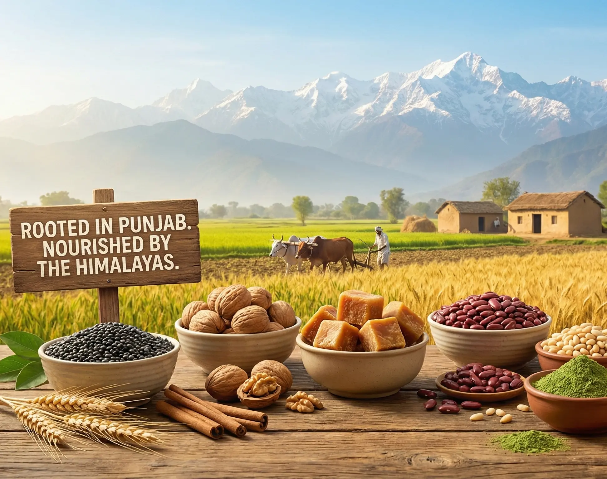 From traditionally prepared jaggery and turmeric in Punjab to nutrient-rich pulses, rajma, walnuts, and chilgoza from Himalayan regions, every product is selected for its origin and quality — not volume.